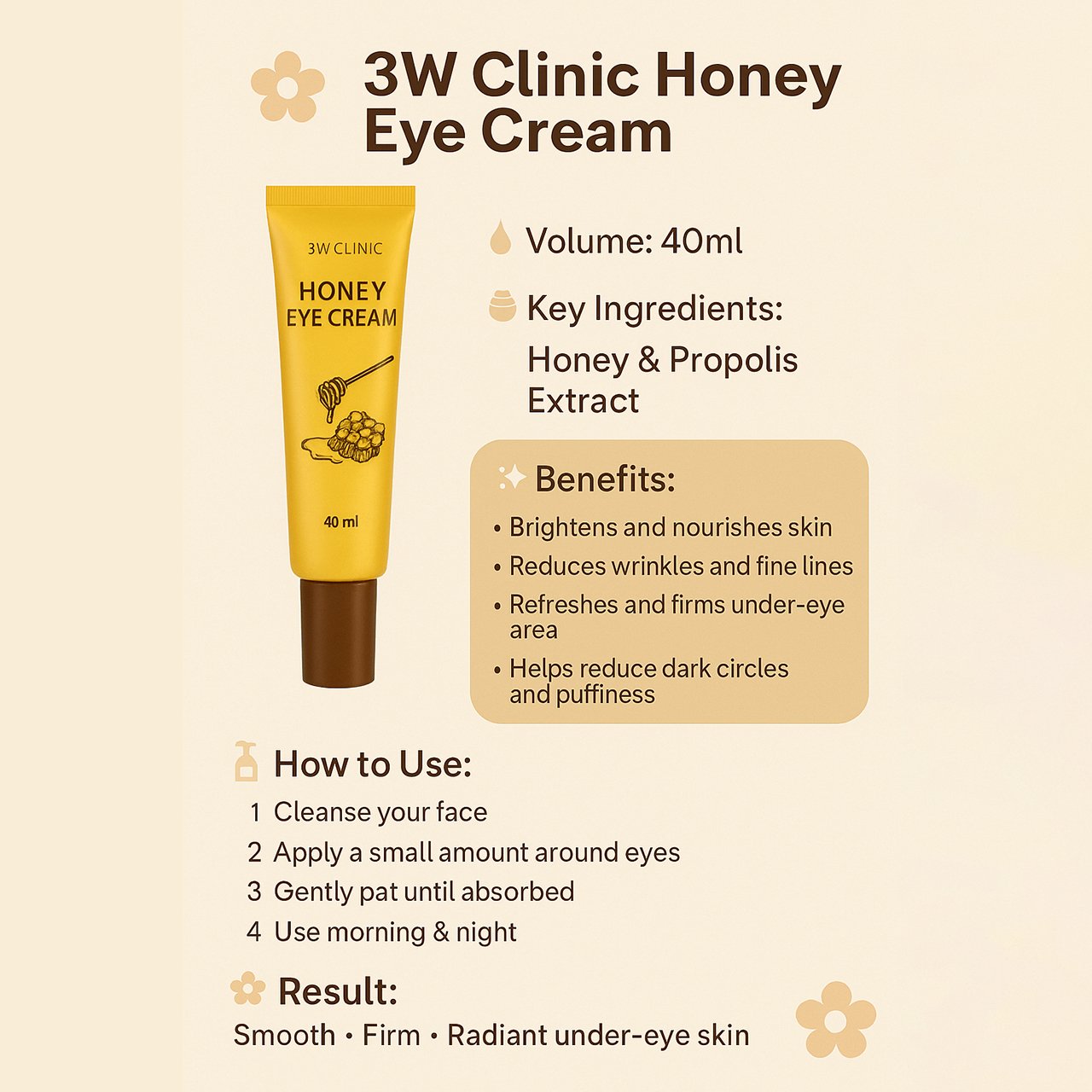 উজ্জ্বল ও বলিরেখা কমায় – চোখের চারপাশের ত্বক থাকে তরতাজা ও তরুণ।