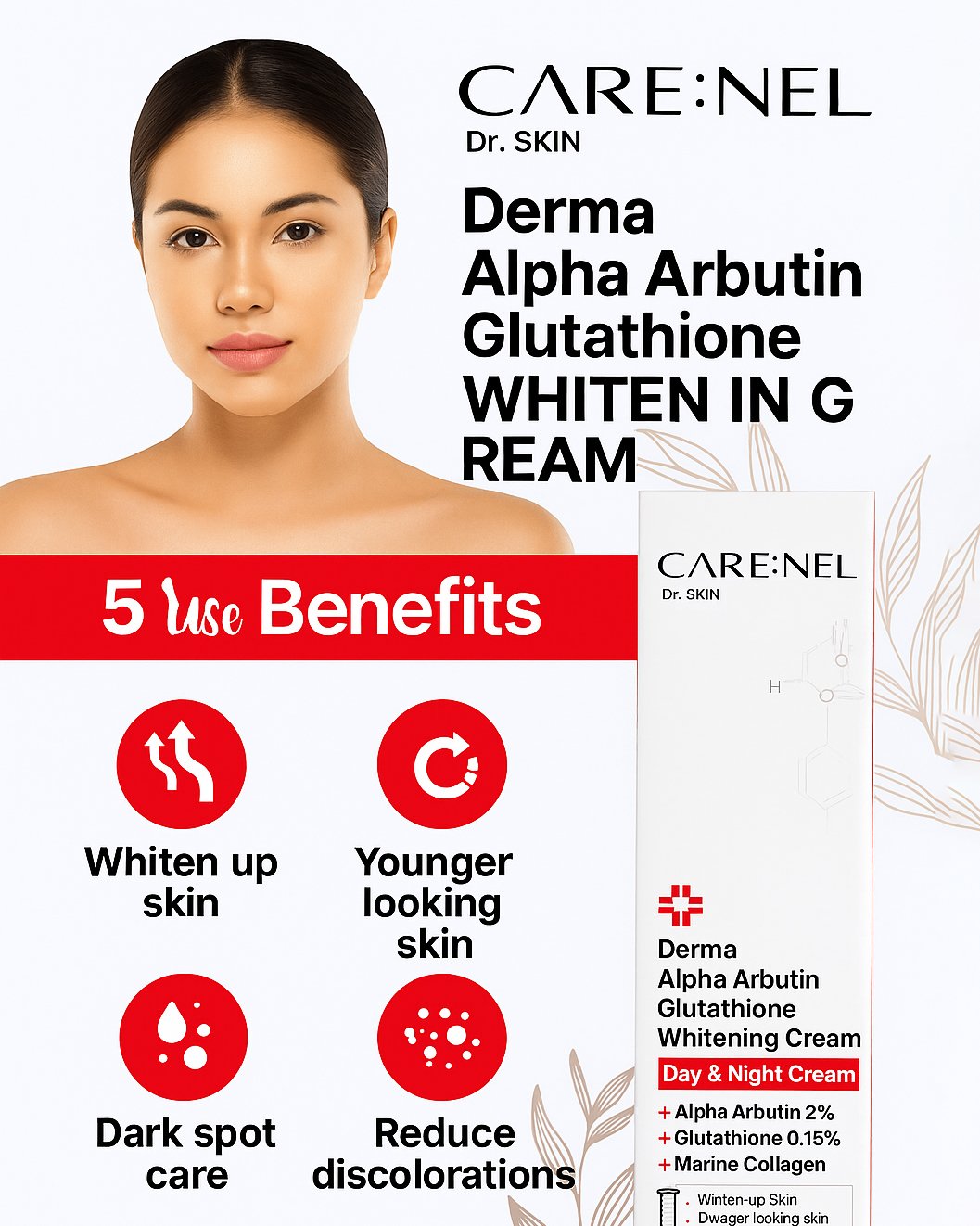 কেয়ার:নেল ডার্মা আলফা আরবুটিন গ্লুটাথিয়ন হোয়াইটেনিং ক্রিম (Care:Nel Derma Alpha Arbutin Glutathione Whitening Cream) ব্যবহার করে পান উজ্জ্বল ত্বক। এটি একটি ডে অ্যান্ড নাইট ক্রিম যা আলফা আরবুটিন ২%, গ্লুটাথিয়ন ০.১৫% এবং মেরিন কোলাজেনের মতো শক্তিশালী উপাদান দিয়ে তৈরি।